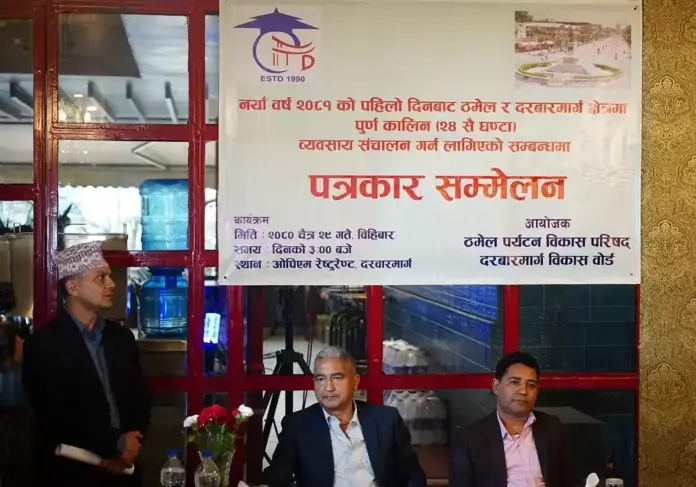 ठमेल पर्यटन विकास परिषद् र दरबारमार्ग विकास बोर्डले आज पत्रकार सम्मेलन गरी ठमेलको भगवानबहाल क्षेत्रमा स्थानीय बसोबास गर्दै आइरहेकाले सो क्षेत्रलाई छाडेर अन्य क्षेत्र २४ सै घण्टा सञ्चालन गर्न लागेको जानकारी दिएको हो ।